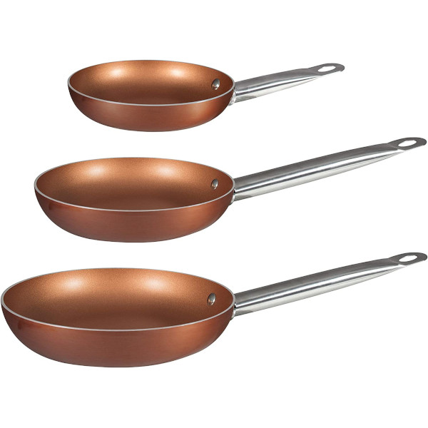 Set de tres sartenes fabricadas en aluminio prensado, que favorece la dispersión del calor, con revestimiento antiadherente en color cobre