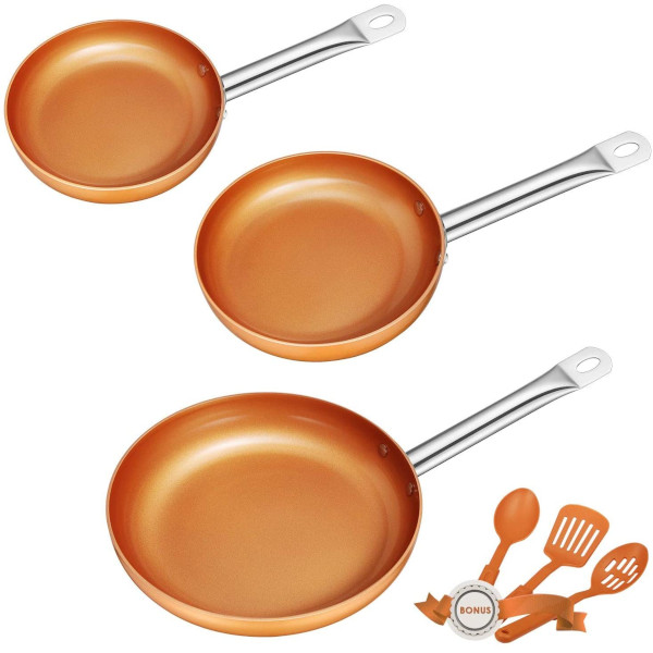 - 🍳 Conjunto de Sartén Asequible: El paquete incluye un conjunto de 3 sartenes de diferentes tamaños, una sartén grande de 28cm, una sartén mediana de 24cm, por último, una sartén pequeña de 20 cm. Completamos el lote con un conjunto de espátulas para satisfacer sus necesidades de cocina