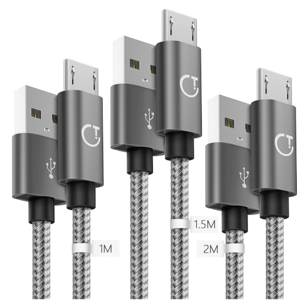 Paquete de tres cables micro USB flexibles de 1 m, 1,5 m, 2 m, duraderos y sin enredos son ideales para una variedad de necesidades de conexión diaria y altamente portátiles.