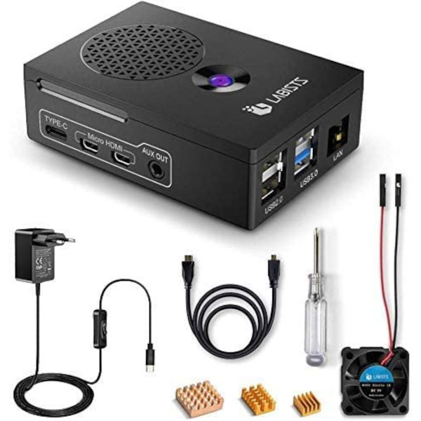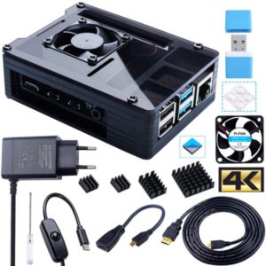 El paquete incluye:1 * Caja negra con una fina textura mate para raspberry pi 4, 1 * ventilador potente, 1 * fuente de alimentación 5.1V 3A con interruptor, 1 * cable Micro HDMI a HDMI, 3 * disipadores de calor, 1 * destornillador magnético pequeño para una fácil instalación, 5 * tornillos, 5 * tuercas, soporte técnico de por vida